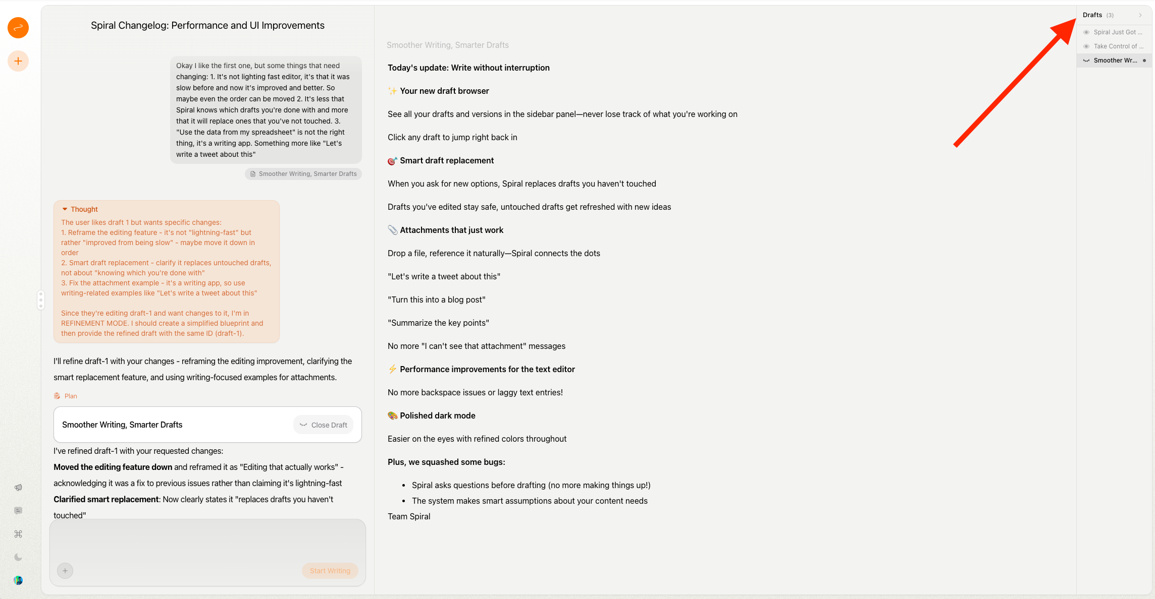 Spiral asks questions before drafting (no more making things up!)