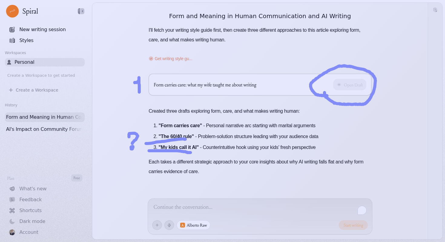 The bot says it drafted 3 pieces but I can only open 2. In this conversation instead, I can’t even open 1.