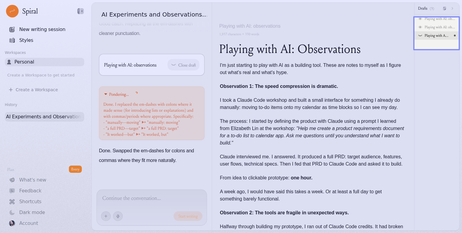 In the chat it calls out the different draft approaches as journal, notes, etc. But the draft titles on the sidebar just have the same titles so it’s hard to distinguish which is which