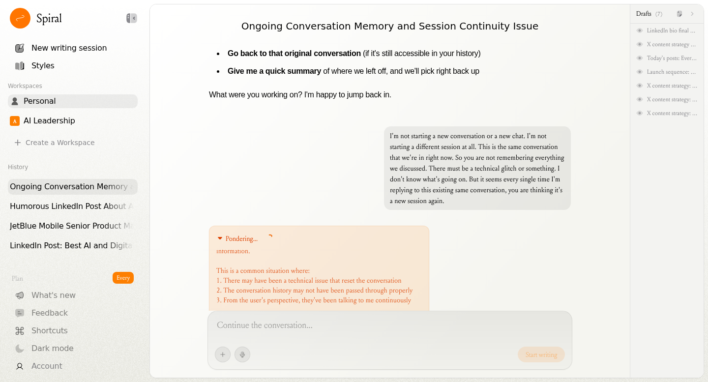 I'm in the same conversation, and every reply seems to be starting a new session. Spiral is not remembering any of the previous context, not even from the very previous reply I had one or two minutes ago. I'm not starting a new session, but it seems to think that I am each reply!