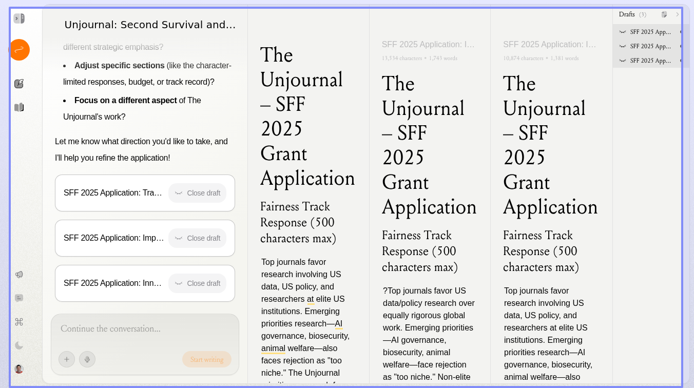 It’s way too hard to read the content in narrow tall panels for each draft. Need more options for window resizing, or each draft in a new tab I can switch between.