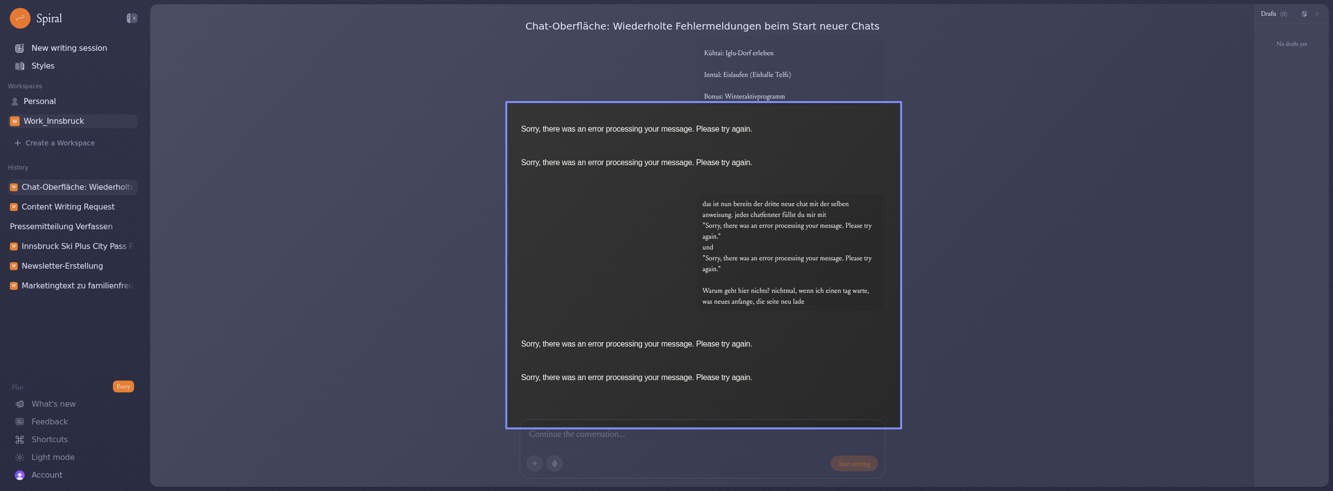 I’ve been trying to make a Press release with spiral, just the drafts. Sometimes it gives me Feedback that it is going to create content now. nothing happens. I can sometimes see the thought process but it does not execute anything. “Sorry, there was an error processing your message. Please try again." across multiple chat sessions, even after waiting a day, starting fresh, and reloading the page.