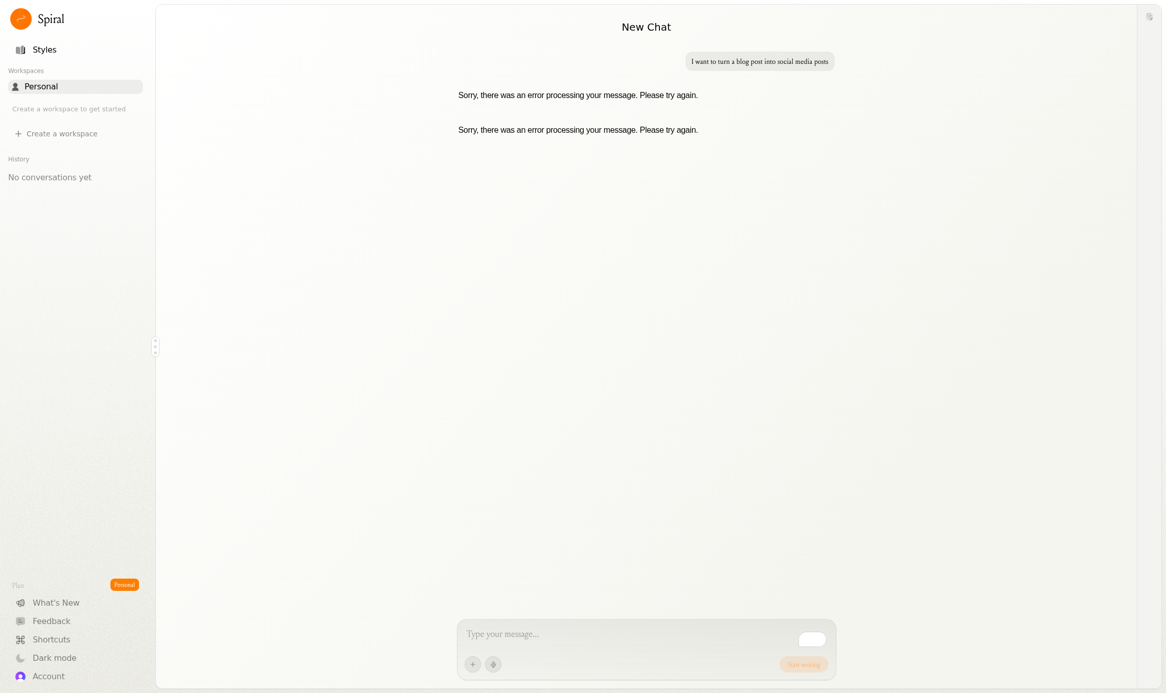Spiral is giving an error message when I try to start a chat: “Sorry, there was an error processing your message. Please try again.”