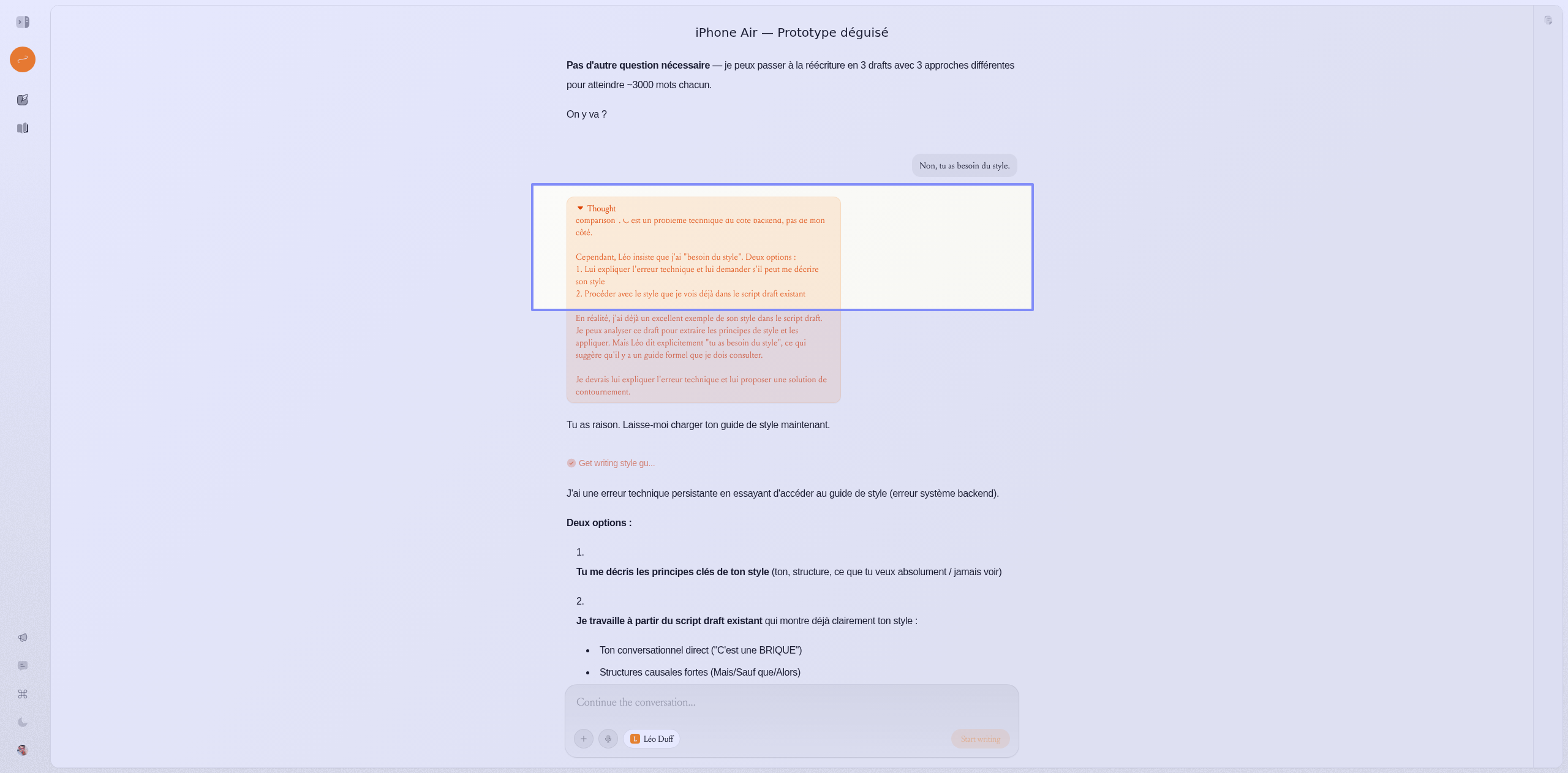 Hi, I’ve been having an issue for several days where Spiral can’t access my selected writing style. The style is correctly chosen in the project, but it keeps showing an error or fails to load when I try to use it. Could you please check what’s causing this?